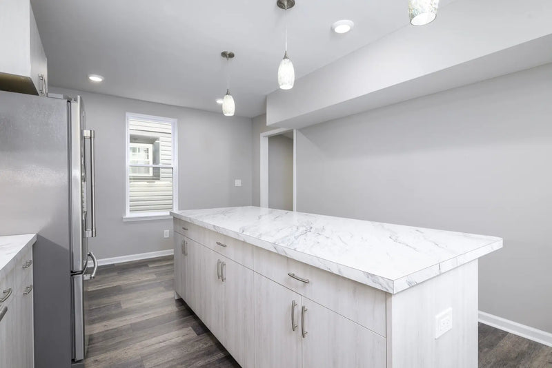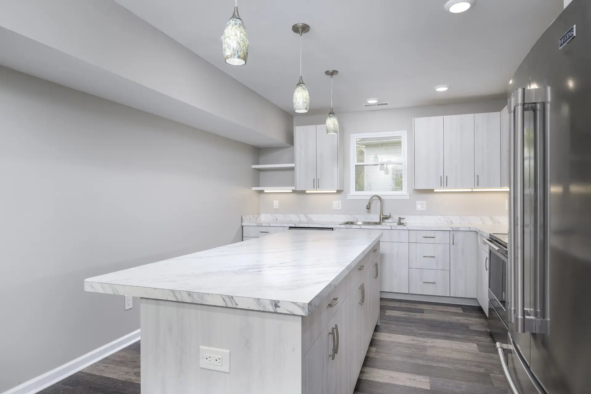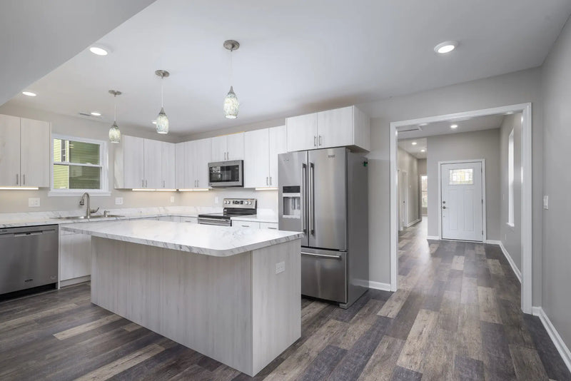 Strategic features like full-height upper cabinets, open shelving for everyday items, and an oversized island with accessible storage make this kitchen as practical as it is attractive. Under-cabinet lighting and modern pendant fixtures bring warmth and depth, while easy-to-clean surfaces and durable materials keep the space ready for rentals or busy family life.