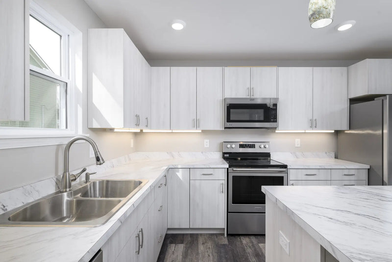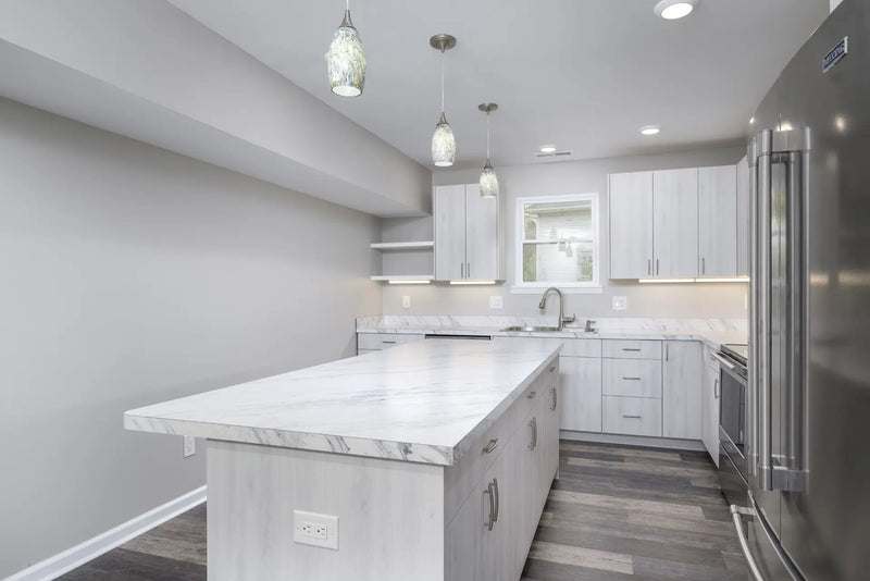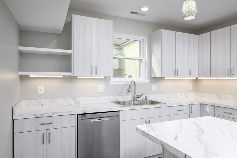We used slab-front cabinets in a soft ash-toned woodgrain finish to give the kitchen a light, airy feel. Paired with white-veined laminate countertops and cool-toned floors, the result is a monochromatic palette that feels open and inviting. Stainless steel appliances and simple brushed nickel hardware added subtle contrast and helped tie the space together.