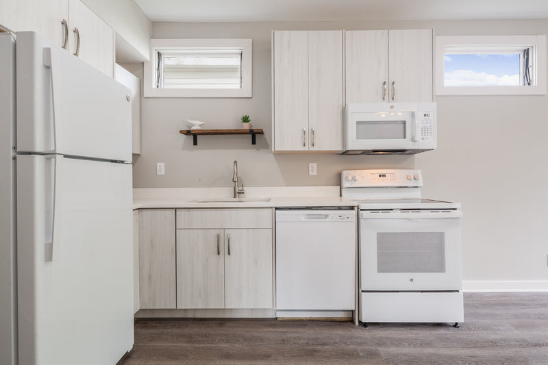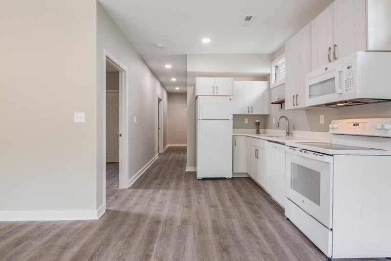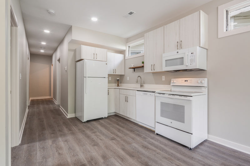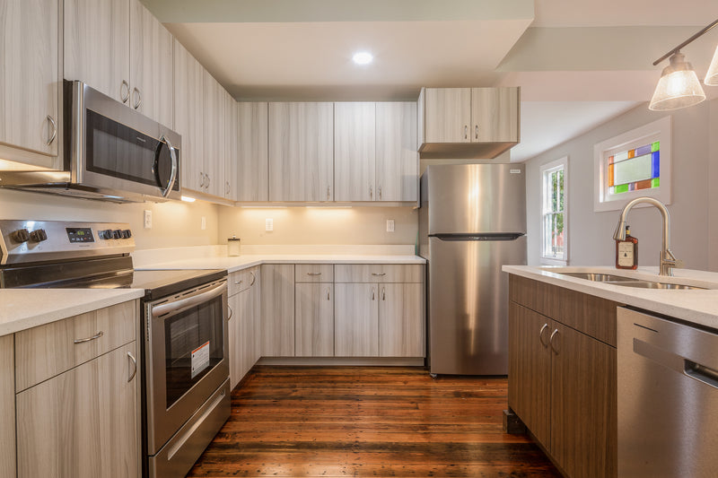 This duplex project included two distinct kitchens, each with its own style. One was designed to feel light and bright, with airy finishes that opened up the space. The other featured a two-tone design with light upper cabinets and darker base cabinets for contrast and depth. Both kitchens balanced functionality with style, featuring layouts that maximized storage and created inviting spaces.